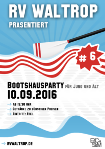 am Samstag, den 10.09.2016 findet unsere Bootshausparty statt. Ab 19:30 Uhr gibt es wieder tanzbare Musik und günstige Getränke in der Bootshalle.